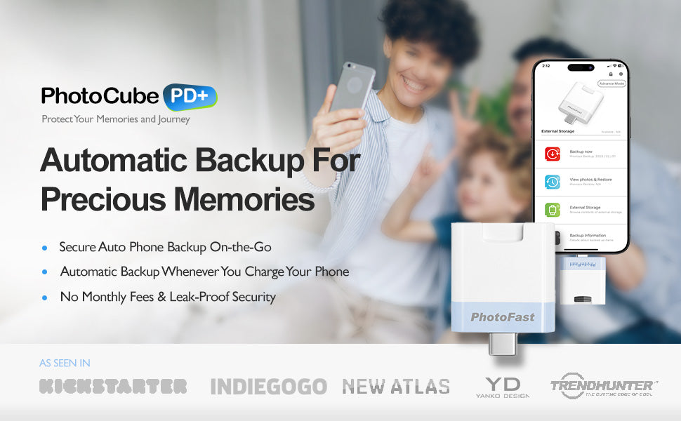 Experience seamless On-the-Go Backup Mode with PhotoCube PD+. Say goodbye to cables and power requirements. Whether you have a Type-C device or the latest iPhone 15, simply plug in and enjoy automatic data backup anytime, anywhere.
